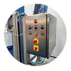 The integrated control panel offers intuitive operation, with options to control pump speed, select automatic or manual mode, and manage system functions. Safety is enhanced with an emergency stop (E-STOP) and main power switch
